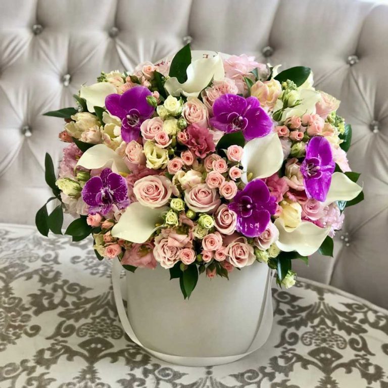 Данную композицию возможно сделать не только в коробке, но и в корзине или просто букетом.